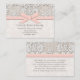 Bonito e parecido com cadarço antigo, veja cartões de cerimônias de rendas vintage com uma fita adesiva cor-de-rosa impressa e design e um sutil coco cremoso com fundo branco damasco. Você pode adicionar informações extras à frente e atrás dessas placas de gabinete. Projetado por Chrissy H. Studios, LLC. Todos os Direitos Reservados.