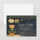 A charming preppy baby shower design featuring a sweet teddy bear dressed in a classic green plaid jacket and bow tie. Above the bear, a delicate clothesline displays tiny baby clothes and shoes, creating a nostalgic storybook nursery scene. The deep navy background and subtle tartan border add a refined, vintage-inspired touch that feels both elegant and playful. Perfect for a stylish baby shower celebration with a classic preppy aesthetic.