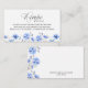 Cartão de cerimônia de Solicitação de Receita solicitando aos hóspedes que compartilhem uma receita favorita com a noiva, decorada com elegante caligrafia e borda floral de aquarela de flores azuis bonito. O modelo está configurado para que você edite o texto se quiser e personalize o verso. Esse delicado design de jardim em azul e branco é perfeito para temas de chá de panela azul, temas botânicos e jardins ou chás de casamento de primavera ou verão. Para coordenar convites, artigos de papelaria e decoração do dia do evento, navegue na Coleção de Chás de panela Florais do Algo Azul ou envie-me uma mensagem para adicionar os itens adicionais de que necessita.