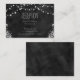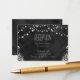String of Lights Chalkboard © Sunny Mars Designs. Cartões de gabinete de recepção de casamento, modernos, elegantes, clássicos, de tendências, personalizáveis em chic, formais ou bonitos, de 3,5" x 2,5", com um belo design de quadro negro, com bolbos de cordas ou luzes de cordas pendurados acima, com um design tropical floral abaixo.