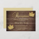 Cartões de recepção de casamento elegantes para enviar com seus convites. Tema rústico / campo. Letras de topografia dourada em ouro falso com folhas de bordo. Fundo em painéis de madeira profunda. Modelos editáveis - fácil adicionar suas informações. Tema de casamento de outono perfeito. Encontrado na coleção de casamento "ENAMORE-SE - CAMPO".