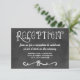 Cartões de recepção de casamento em lousa de giz encantadores para uma ocasião casual e sofisticada apresentam fontes no estilo manuscrito e desenhos de pergaminho que têm uma aparência de giz branco em um fundo que tem uma aparência texturizada de lousa preta rústica.