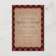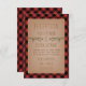 Um cartão de recepção de casamento rústico com uma ilustração de galhos de árvore sempre-verde. O fundo é xadrez vermelho e preto.