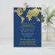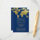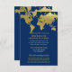 Cartão de informações de casamento apresenta um design de borda de mapa mundial. Esquema de cores azul naval elegante e dourado falso em relevo.