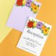 Coleção de casamento com vibrante design floral vermelho, amarelo dourado e roxo claro acentuado com frutas cítricas laranja e limão e folhagem botânica