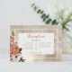 Este lindo desenho floral apresenta um buquê cheio de flores cor de pêssego, rosa e brancas com um fundo brilhante dourado champanhe. É parte da coleção Peach Mimosa Blooms Floral Wedding Suite de cartões criada pela Simply Farmhouse Press.