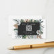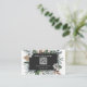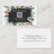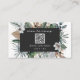 Cartão RSVP de casamento com código qr na frente e informações adicionais na parte traseira. A frente apresenta botânicos tropicais em torno da forma retangular de cinza escura.