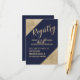 Cantos de lantejoulas douradas falsas impressas elegantes, chiques e glamorosas e escrita dourada em um fundo azul marinho, cartão de registro de presente de casamento. Este design clássico e sofisticado é perfeito para o graduado elegante, sofisticado e trendy. Personalize com sua própria mensagem na frente e um monograma inicial personalizado no verso. Todo o design de impressão de foto.