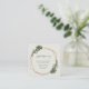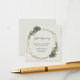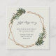 Cartão de fechamento de chá de bebê boho com "Registro de Presentes" em uma fonte elegante, juntamente com uma lista de lojas dentro de uma moldura geométrica dourada, rodeada por folhagens e flores brancas. Um design botânico perfeito para uma celebração boêmia no verão. Este design neutro é ótimo, independentemente de você estar esperando um menino ou uma menina.