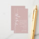 Mini tamanho A Caligrafia Moderna QR Code Dusty Rosa Pink Wedding RSVP está em uma caligrafia elegante rodada e à esquerda, com sua mensagem à direita. Personalize facilmente o resto do texto para seus próprios detalhes e substitua o código QR de amostra no verso por seu próprio, simplesmente substituindo o URL de código de amostra pelo URL do seu próprio site de casamento.