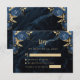 Este elegante cartão de cercado RSVP de casamento apresenta buquês florais azuis saltados com folha verde de folhas douradas em dois cantos, em uma imagem de fundo do agate marinho azul d'água. O texto personalizável combina fontes de serifa e escrita manual de cor dourada. O verso apresenta um marinho azul- e ouro floral e design agate correspondentes.