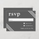Um simples e elegante cartão de resposta de casamento em cinza médio carvão com cantos triplos em branco e texto branco. O título do RSVP se destaca proeminentemente no canto superior esquerdo do cartão para um visual contemporâneo e sofisticado. Personalize a data do RSVP com a data de resposta necessária. A paleta de cores luxuosa define o tom para uma adorável celebração de casamento com convites e artigos de papelaria correspondentes. Você pode alterar a cor deste cartão para combinar com a paleta de cores do seu casamento escolhendo "clique para personalizar ainda mais" na parte inferior do modelo de texto.