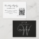Um convite de casamento personalizado e customizado, simples, porém elegante: Preto e Branco com Monograma. Um cartão incluso de casamento que direciona os convidados ao site do casamento, onde eles podem confirmar presença e encontrar todos os detalhes do casamento, além de uma foto de amostra do código QR para maior comodidade, que você pode facilmente substituir e personalizar. Altere facilmente todos os detalhes atuais. Tendência e chique, porém elegante e atemporal - combina perfeitamente com muitos estilos de casamento de hoje, então sinta-se à vontade para personalizar e personalizar com o texto do seu casamento. O design apresenta os nomes dos noivos em uma fonte elegante com fonte de texto simples. Mostrado em um tema preto e branco com um fundo de pano de linho preto na parte de trás, mas pode ser personalizado para as cores do seu casamento para o texto e o fundo. Adicione outros gráficos, textos ou monogramas para personalizar este modelo na "Editar usando a ferramenta de design" abaixo.