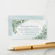 Inclua este cartão do site do casamento com os convites para fornecer todos os detalhes do seu evento especial. A informação importante está na frente, enquadrada por uma moldura geométrica dourada e buquês de cor aquática de eucalipto verde. O dorso tem uma textura de aquarela azul empoeirada.