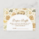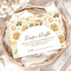 Um design safari de estilo conto de fadas doce, apresentando animais de bebê em aquarela suave, incluindo leões, girafas e elefantes, cercados por verdejante selva suave e detalhes botânicos delicados. A paleta neutra quente de creme, ouro mel e oliva suave cria uma estética atemporal inspirada na natureza, enquanto o layout arqueado elegante deixa um espaço lindo para detalhes de evento personalizados.