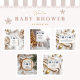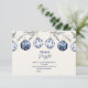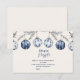 Este elegante design de chá de bebê apresenta um trio de enfeites de Natal azuis pintados à mão pendurados em cordel e galhos de pinheiro. Com flocos de neve delicados e motivos botânicos em um estilo de aquarela suave, este tema de inverno é perfeito para celebrar um bebê durante a aconchegante temporada de festas.