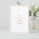 Design front features a pure white background to elegant, pale-pink heading displayed in center. The image of an elegant cross graces the top, as the image of joined wedding rings appears below heading. Entire design is framed by a fine, elegant border which adds a classy appearance to the design. Reverse features text displayed in the proper format for a traditional Catholic enclosure card which includes reception information, accommodations information. Bridal registry information is featured at bottom.