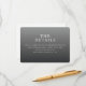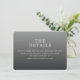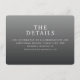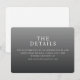 Este cartão de acompanhamento de casamento apresenta um design minimalista com um fundo gradiente que transita de cinza claro para escuro, criando uma aparência elegante e sofisticada. O layout é limpo e bem espaçado, enfatizando a hierarquia do texto com tipografia serifada em negrito para "OS DETALHES" e fontes serifadas mais claras para informações adicionais. A paleta de cores em tons de cinza adiciona um toque moderno, mantendo um tom formal, perfeito para transmitir detalhes importantes de forma clara. Ideal para casamentos, este cartão fornece uma maneira profissional e direta de direcionar os convidados ao seu site para mais informações.