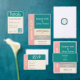 This modern city wedding design features a clean color block design created for contemporary and urban celebrations. The minimalist layout combines refined typography with a carefully balanced palette of transformative teal, soft champagne, dusty coral, and warm gray, delivering a stylish and elegant look.