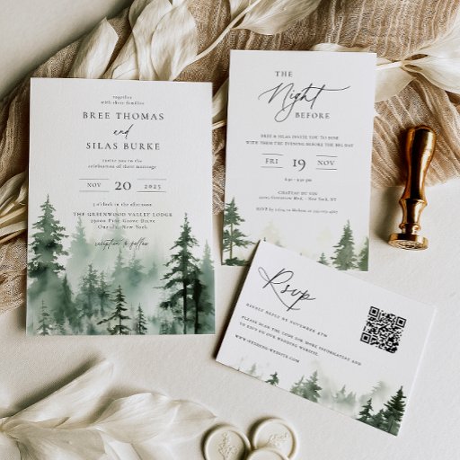 Uma nota sobre presentes, árvores de pinheiros de aquarela, cartão de cerco de casamento.