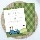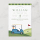 Primeiro tema de aniversário de golfe "Vamos Par Tee" com um campo de golfe e cenário de carro dourado e reverso de padrão argyle.