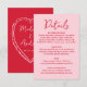 Share all the important information with this romantic wedding details card designed to coordinate with Valentine’s Day-inspired wedding stationery. The front of the card features “Details” displayed in a bold handwritten red script with your wedding information shown below on a soft pink background, making it perfect for sharing accommodations, travel information, dress code notes, or weekend events. The back of the card showcases a hand-drawn pink heart framing the couple’s names and wedding date on a rich red background, adding a playful retro touch. With its handwritten accents, cheerful color palette, and vintage-inspired charm, this wedding details insert is ideal for February weddings, Valentine’s weddings, and couples who love fun, modern stationery with a heartfelt feel.