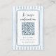 A Spanish language RSVP enclosure card to match our Whimsical Retro Blue Stripes Wedding collection. An English version of this design is available in my store for bilingual weddings. This design features a navy blue hand-drawn frame against a light blue striped background. There is a QR code to RSVP online & see other details on your wedding website. The back of the design features your custom photo to perfectly match the front. View the collection linked on this page for matching items. Feel free to message me with any questions, I'll be happy to help! RSVP de boda en español para que los invitados confirmen su asistencia. Tarjeta editable con temática costera, con rayas azules y diseño elegante inspirado en la playa, perfecta para bodas junto al mar.
