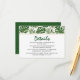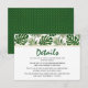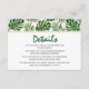 Cartão de inserção de detalhes de casamento verde e dourado com folhas tropicais. Um design bonito que exibe folhas de Filodendro Folha de Fenda (Monstera deliciosa) ou Planta Queijo Suíço e folhas de palmeira em verde com contorno dourado. A parte de trás é coberta com um padrão de bolinhas douradas em verde escuro. Escolha-o para o seu casamento tropical de praia ou destino de casamento.