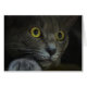 Um tiro na face de um gato cinza com olhos amarelos e pupilas dilatadas, descansando a cabeça sobre a pata e encarando intensamente algo atrás da câmera.