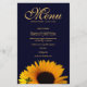 Cartão de cardápio animado e elegante, com uma foto de girassol em fundo azul marinho. Perfeito para casamentos, noiva ou chás de fraldas. O texto adicional é impresso no verso para atender às suas necessidades.