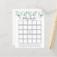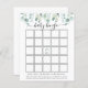 Placa de bingo chá de fraldas com uma cascata aquosa de eucalipto e verde. Uma maneira divertida de interagir com os convidados do chá enquanto a mamãe a ser abre seus presentes.