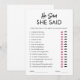 Adicione um toque moderno ao seu chá de noiva com cartões personalizáveis He Said, She Said em preto e branco, perfeitos para a última festa antes do anel! Os convidados se divertirão tentando adivinhar quem disse o quê, tornando-o um complemento divertido e memorável para as festividades.