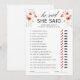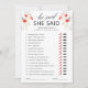 Prepare-se para adicionar um toque de elegância ao seu chá de noiva de verão ou primavera com nosso jogo 'Ele Disse Ela Disse' Cartão de Jogo de Chá de Noiva Aquarela Vermelha. Este cartão de jogo de chá de noiva personalizável apresenta flores vermelhas pintadas à mão com aquarela e caligrafia elegante, tornando-o um complemento perfeito para sua celebração.
