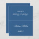 Um cartão clássico de casamento azul com o nome do convidado e o número da mesa impresso na sua frente, os nomes da noiva e do noivo e a data do casamento impressa no outro lado (isto é, a outra metade, antes de dobrá-la). Todo texto é um script caligráfico branco. Tamanho: 4,5" x 5,6" antes da dobragem, ou seja, 4,5" x 2,8" após a dobragem.