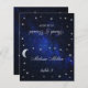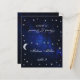 Um cartão celestial de casamento com o nome do convidado e o número da mesa impresso na sua frente, os nomes da noiva e do noivo e a data do casamento impressa no outro lado (ou seja, a outra metade, antes de dobrá-la). Todo texto é cinza leve, quase um script caligráfico branco. O fundo é o céu noturno com a lua e estrelas à volta do texto. A lua e as estrelas são cinzas de prata (folha de prata falsa). Tamanho: 4,5" x 5,6" antes da dobragem, ou seja, 4,5" x 2,8" após a dobragem. A foto noturna estrelada é de Felix Mittermeier, de Pixabay, e está livre para uso comercial.