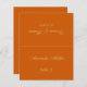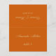 Um simples cartão de local de casamento laranja queimado com o nome do convidado e o número da mesa impressos na frente e os nomes dos noivos e a data do casamento impressos no outro lado (que é a outra metade, antes de dobrar). Todo o texto é em letra cursiva amarelo dourado.