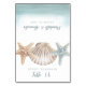Projetado para combinar com a minha coleção de casamento Starfish Sea, este é um cartão de local perfeito para um casamento náutico ou tema de praia. A frente apresenta estrela-do-mar em aquarela e uma concha com modelos de texto para digitar nomes e números de mesa. O verso apresenta os nomes dos noivos e a data do casamento acentuados por ondas do oceano pintadas à mão. O interior do cartão é azul porto.