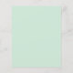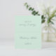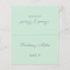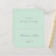 Um simples cartão de local de casamento verde menta com o nome do convidado e o número da mesa impressos na frente e os nomes dos noivos e a data do casamento impressos no outro lado (que é a outra metade, antes de dobrar). Todo o texto é em letra cursiva cinza.