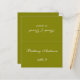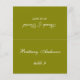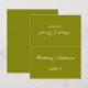 Um simples cartão de local de casamento verde oliva com o nome do convidado e o número da mesa impressos na frente e os nomes dos noivos e a data do casamento impressos no verso (que é a outra metade, antes de dobrar). Todo o texto é branco.