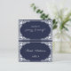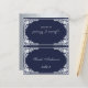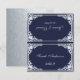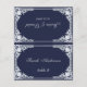 Um cartão de lugar de casamento azul-marinho vintage com o nome do convidado e o número da mesa impressos na frente e os nomes dos noivos e a data do casamento impressos no verso (ou seja, a outra metade, antes de dobrá-lo). Possui uma moldura antiga com decorações de folha de prata falsa e também prata falsa no interior (no verso, antes de dobrá-lo). Todo o texto é cinza, escrito em caligrafia elegante. O fundo é azul-marinho.