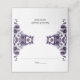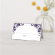 Um cartão de mesa de casamento floral roxo que inclui os nomes da noiva e do noivo junto com a data do casamento.