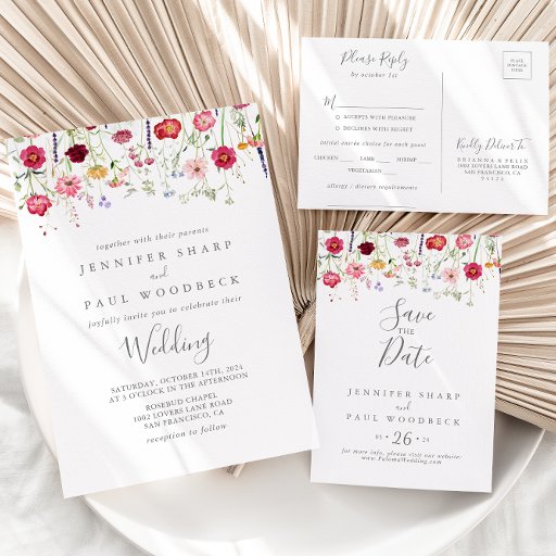 Este simples cartão de casamento multicolorido é perfeito para um casamento rústico. O design apresenta uma variedade multicolorido de flores silvestres cor-de-rosa, pinceladas, roxas, amarelas, brancas, violetas, vermelhas e burgundy. Personalize a parte de trás do cartão de lugar com os nomes da noiva e do noivo e a data.