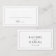 Este cartão de casamento minimalista é perfeito para uma simples recepção de casamento. A design romântica moderna apresenta a tipografia clássica, em preto e branco, emparelhada com uma caligrafia rústica, mas elegante, com estilo voltado para a mão. Personalizável em qualquer cor. Mantenha o design simples e elegante, como está, ou personalize-o adicionando seus próprios gráficos e trabalhos de arte. Personalize a parte de trás das cartas com os nomes da noiva e do noivo e a data. Compre em massa e escreva os nomes de convidado e os números de tabela nos cartões impressos quando eles chegarem.