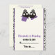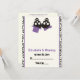 Cartão de lugar de casamento roxo de Halloween caveiras elegantes, apresentando um casal de caveiras pretas noiva e noivo em fundo marfim e uma borda com padrão de caveiras. O noivo usa um chapéu roxo e a noiva um laço roxo. Dobre o cartão ao longo do centro. Precisa de ajuda ou de uma paleta de cores diferente? Basta clicar no botão Contato abaixo do produto e solicitar!