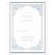 Design de moldura ornamental vintage elegante com escrita estilosa em cor azul poeirento, simples e clássico, ótimos cartões de lugar dobráveis para casamento moderno clássico, casamento vintage romântico e casamento tradicional formal.