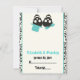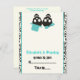 Cartão de lugar de casamento Elegantes caveiras Halloween turquesa, apresentando um casal de caveiras pretas noiva e noivo em fundo marfim e uma borda com padrão de caveiras. O noivo usa um chapéu azul turquesa e a noiva um laço azul turquesa. Dobre o cartão ao meio.