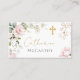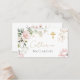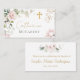 Elegante cartão de lugar plano para Batismo/Crisma com ilustração de bela rosa cor-de-rosa, folhagem verde e folhas douradas em estilo aquarela. No topo do cartão há uma imagem da Cruz. Devido a este tipo de cartão, não é possível incluir nomes individuais. Neste design, você pode remover o nome da amostra (cartão em branco). Então você terá que escrever os nomes individuais à mão.