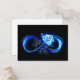 Luminous infinity symbol with glowing, beautiful, lushly blooming rose made of blue flames on black background.