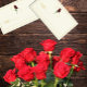 elegância do eterno: Casamento de rosas vermelhas minimalista tradicional com tipografia de guião dourada e fundo de marfim.