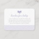 Projetado para coordenar com a coleção de chás de fraldas gingham roxo Design de Lea Delaveris, este convite é perfeito para solicitações especiais para convidados chás de fraldas. O texto "livros para bebê" do roteiro roxo doce pode ser editado, assim como a solicitação abaixo. Ele também apresenta um padrão de gingham púrpura lilac na parte inferior e um padrão de bolinhas roxo na parte traseira que corresponde ao arco na parte frontal.